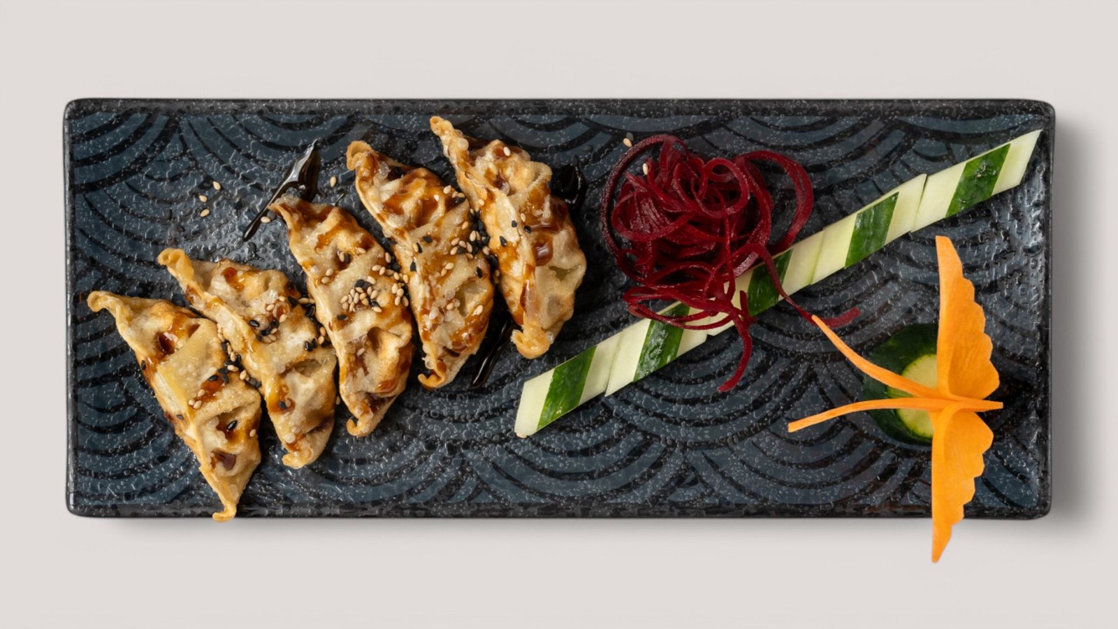 gebratene Teigtaschen gefüllt mit zartem Hähnchen, Teriyakisauce, Sesam und frischen Frühlingszwiebeln
